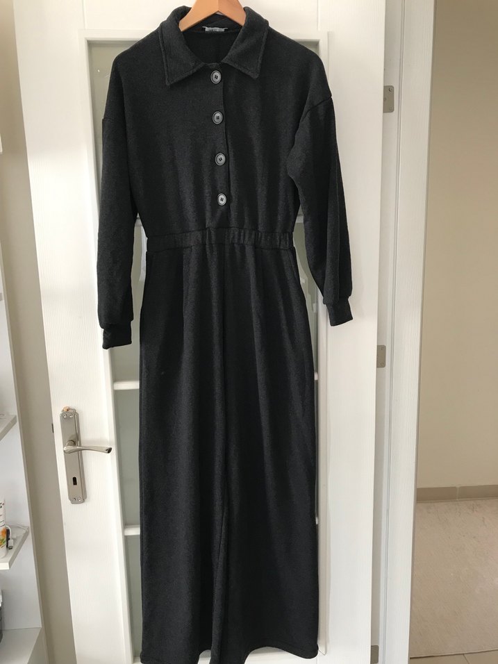 Düğmeli ön cepheli, yakalı siyah uzun tulum. Uzun kollu, bol kesim, yumuşak ve sıcak kumaştan günlük kullanım için uygundur.