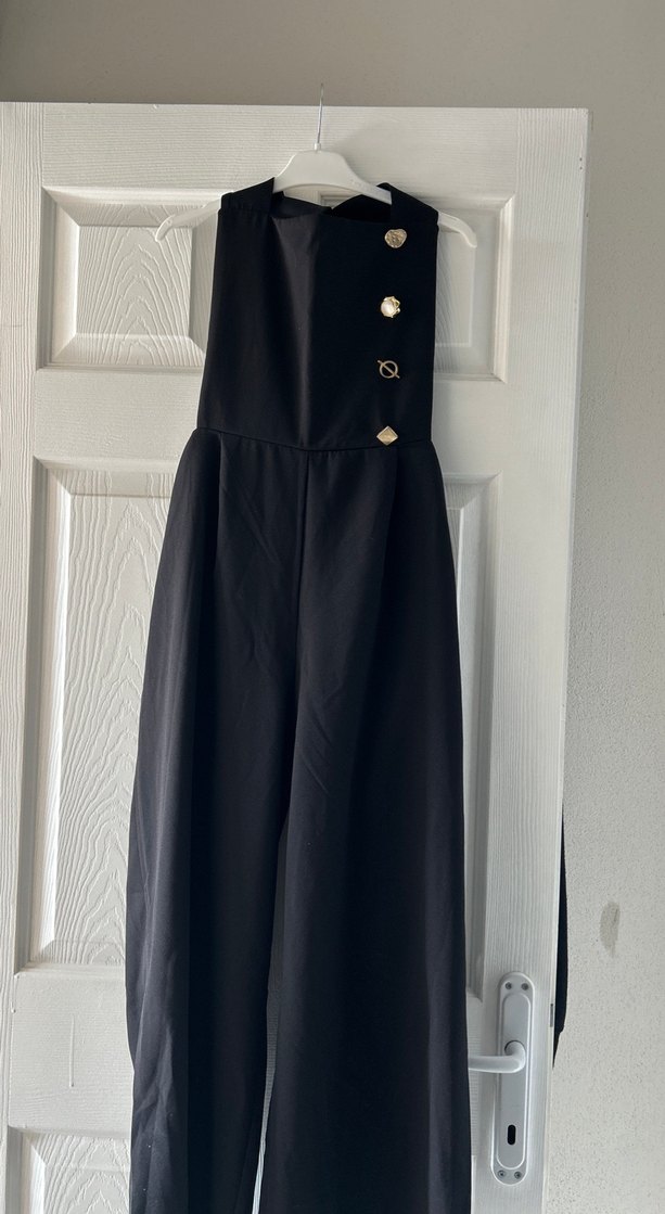 Siyah, uzun kesim kadın tulumu, askısız ve kolsuzdur. Düğme detaylı, regular fit ve sentetik kumaştan, ofis kullanımı için uygundur.