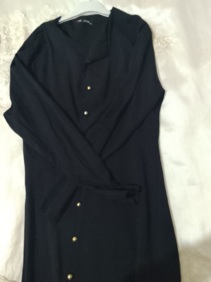 Siyah uzun elbise, düğmeli ve yakası kesik detaylıdır. İpeksi kumaştan yapılmış, uzun kollu ve rahat kesimdir. Günlük şıklık için uygundur.