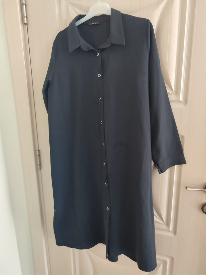 Düğmeli önü ve kısa kollu, siyah uzun tunik. Yakalı ve bol kesim, sentetik kumaştan üretilmiştir. Günlük rahat kullanım için uygundur.