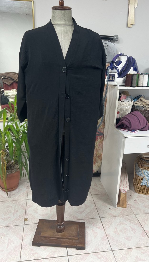 Düğmeli, siyah uzun kadın uzun tunik, yakalı ve sentetik kumaştan üretilmiştir. Regular fit kesimiyle günlük kullanıma uygundur, minimalist sokak tarzını yansıtır.