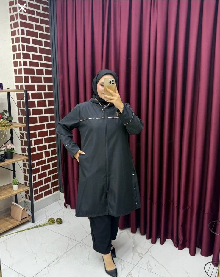 Düğmeli detaylara sahip siyah uzun yağmurluk, yüksek yakalı ve uzun kolludur. Sentetik kumaştan üretilmiş, etnik desenli, rahat kesim ve mütevazı sokak stiline uygundur. ️