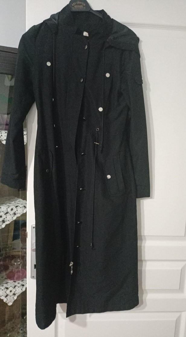 Düğmeli Siyah Uzun Kadın yagmurluk