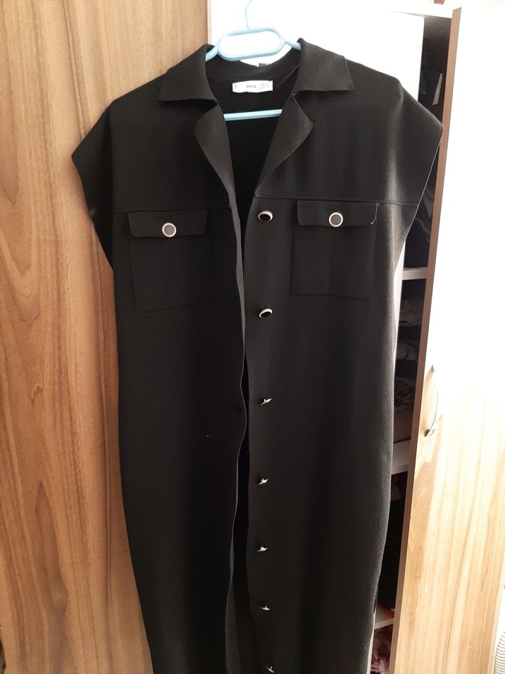 Düğmeli, yakalı ve uzun kesim olan bu siyah kadın yeleği, kolsuz ve düz yapıya sahiptir. İş ve günlük sokak stiline uygundur. boy 120 cm