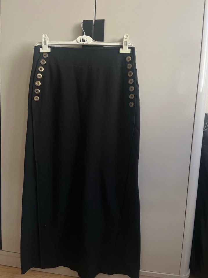 Düğmeli tasarıma sahip siyah uzun etek, düz kesim ve sentetik kumaştan üretilmiştir.