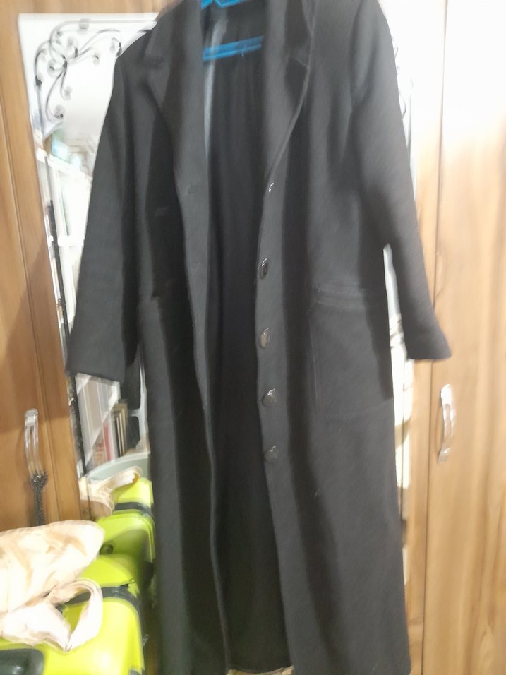 Düğmeli, siyah uzun kaşe kadın 38 40 bedene uygundur kaban, kesikli yaka ve uzun kolludur. Rahat kalıplı ve yumuşak, sıcak kumaştan üretilmiştir.