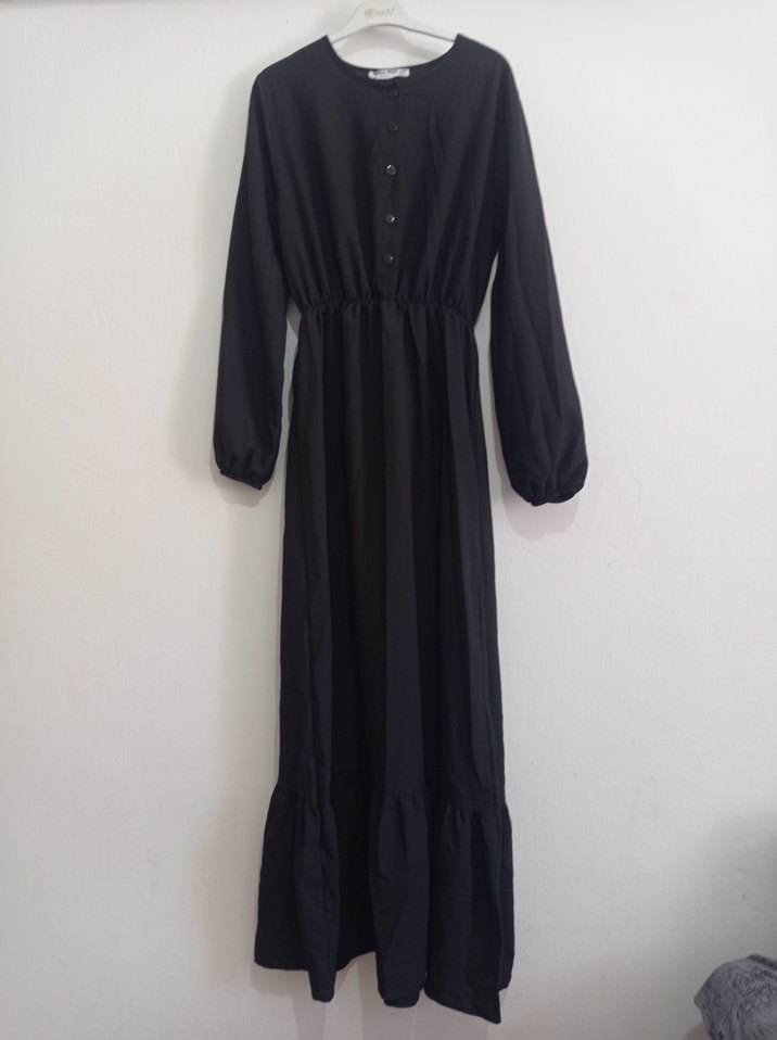 Düğmeli Siyah Uzun Keten Elbise