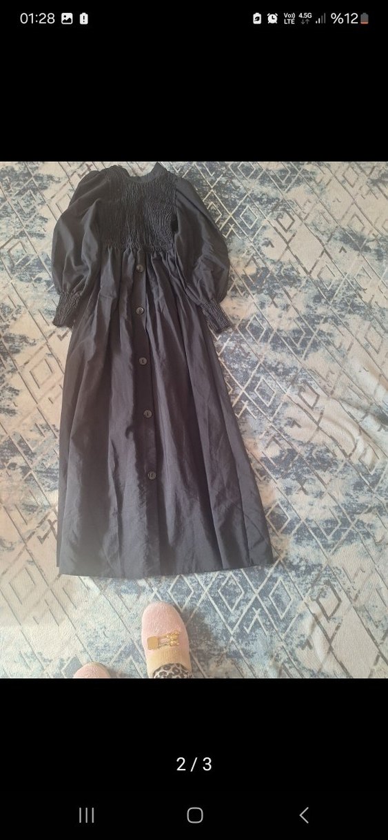 Siyah uzun keten elbise, bol kesim, uzun kollu ve kayık yaka detaylıdır. Düğmeli ön kısmı bohem tarzı yansıtır.