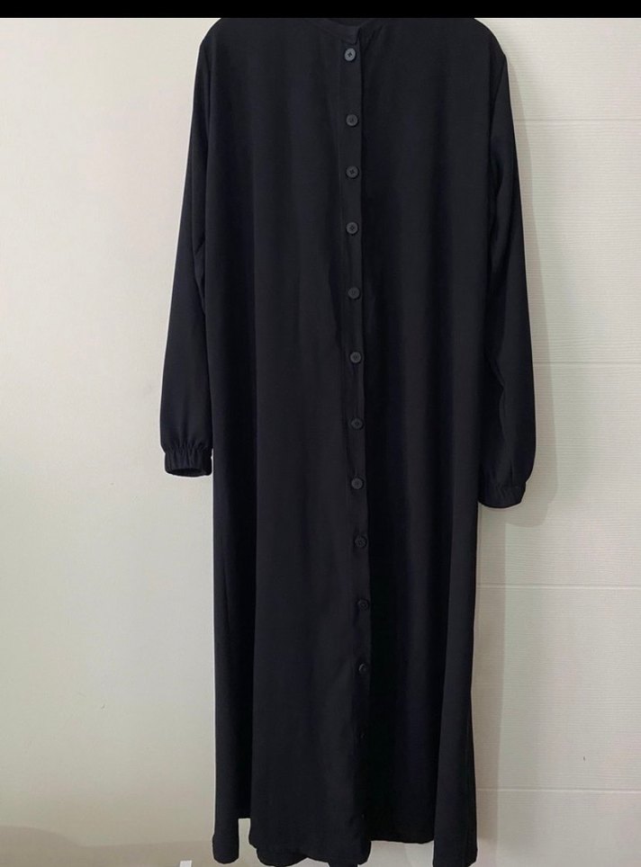 Düğmeli sırt kısmı düğmeli, uzun kollu, yüksek yakalı siyah keten uzun elbise. Minimalist ve desen içermeyen tasarımıyla sade ve mütevazı bir tarz sunar.