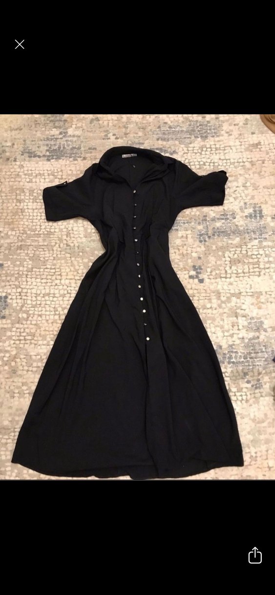 Düğmeli siyah keten uzun elbise, kısa kollu, notlu yaka ve bol kesim ile gotik tarzda, ofis kullanımı için uygundur. Marka temsili