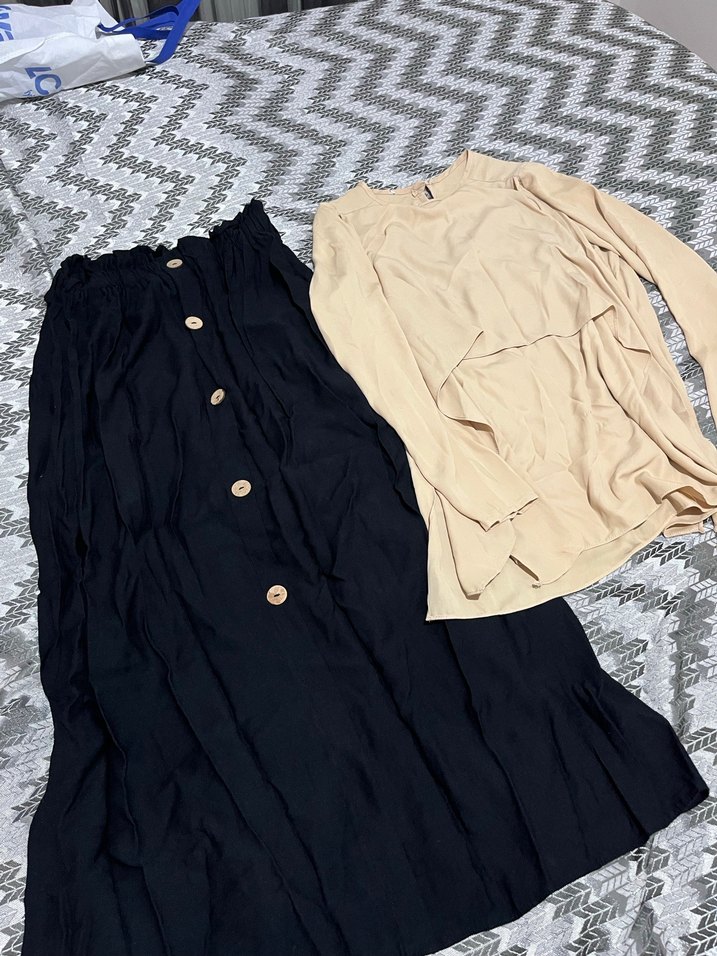 Siyah uzun keten etek, düğmeli ve bol kesimdir. Rahat ve günlük kullanım için uygundur. Alt üst takımdır