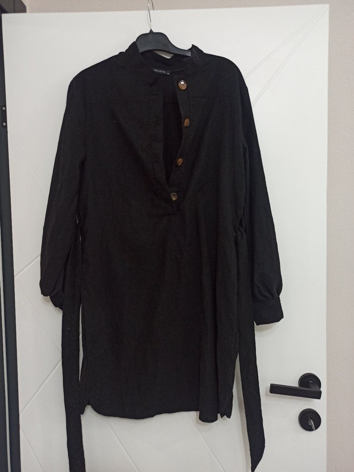Düğmeli, uzun kollu, keten kumaştan yapılmış siyah uzun kadın elbise Salaş kesimi ve kesik yaka detayıyla ofis ve günlük kullanıma uygundur.