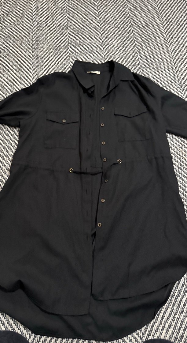 Düğmeli, kısa kollu, siyah uzun keten gömlek. Notlu yakalı, rahat kesim ve günlük sokak stili için uygundur.