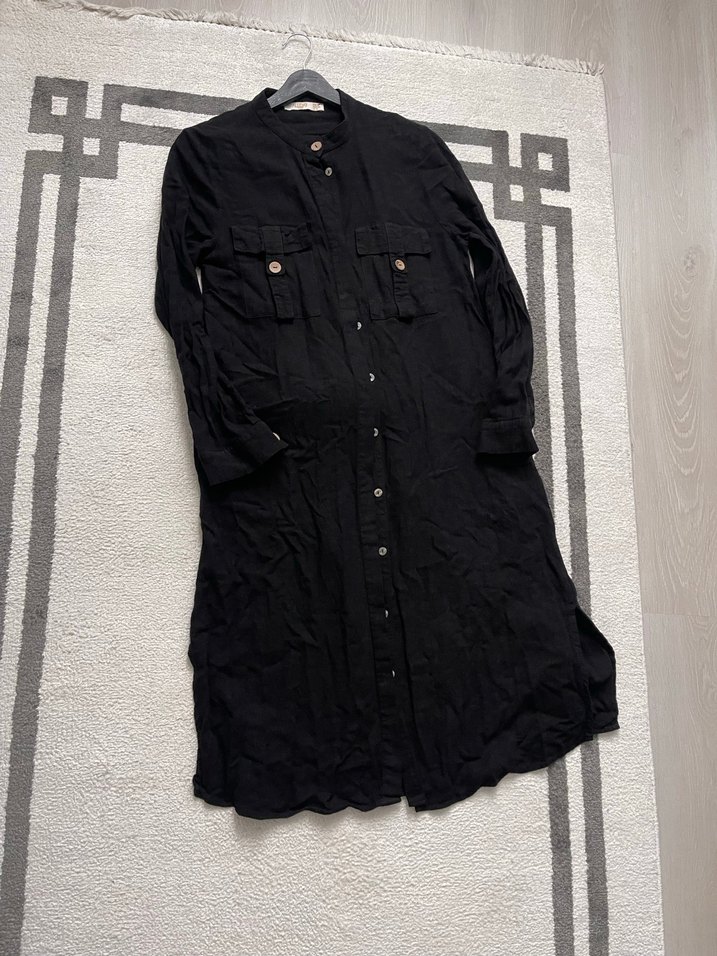 Siyah keten uzun takım , düğmeli önü, uzun kollu ve rahat kesimlidir. Hakim yaka ve günlük sokak stiline uygundur. Pantolon boyu 95 cm tunik boy 105 cm dir.