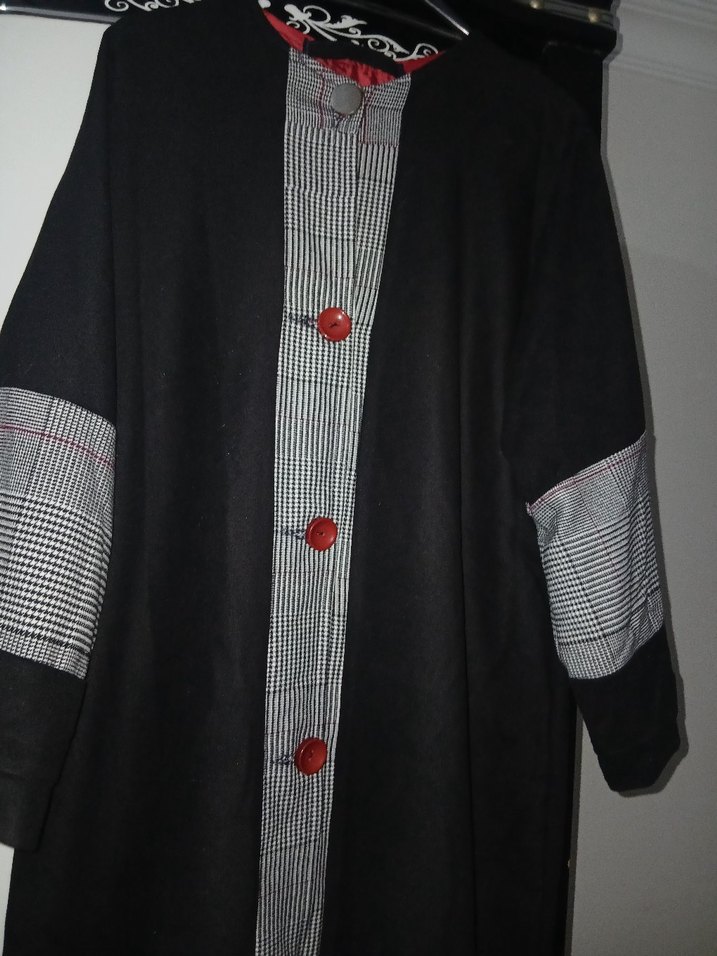 Düğmeli, siyah uzun kadın kışlık pardesü Yaka kısmı kırmalı ve düğmeli. Kollarda ve ön kısımda ekose detaylar bulunur Kış için uygundur.