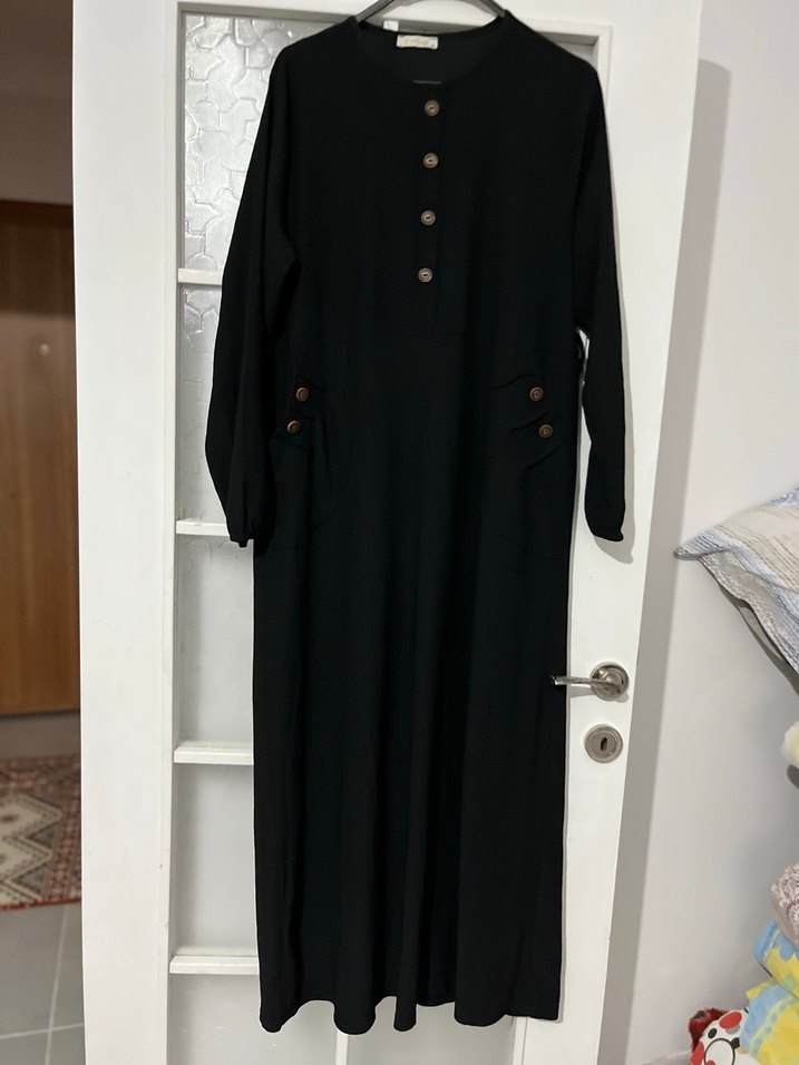 Düğmeli, uzun kollu siyah elbise, bol kesim ve ceplerinde düğme detaylarına sahiptir. Notlu yaka ve sade, desensiz tasarımı yumuşak ve sıcak kumaştan üretilmiştir.