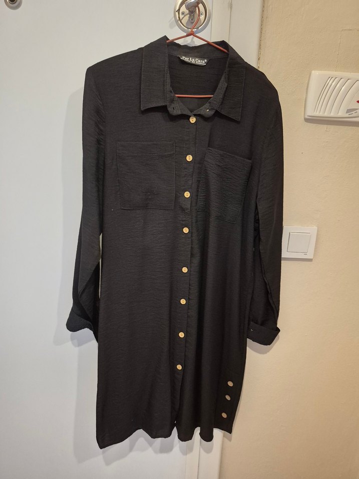 Düğmeli, uzun kollu ve keten kumaştan yapılmış siyah gömlek. Salaş kesimi ve kesik yaka detayı ile günlük rahat sokak stili için uygundur.