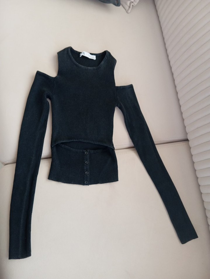 Düğmeli, uzun kollu, siyah crop kazak. Omuzları açık ve midi boyda, yumuşak sentetik kumaştan üretilmiştir.Omuz ve göbek dekoltelidir.Bir kere giyildi.Yepyenidir.Dar kesimdir.50 kg ve altı bedenler için rahatlıkla giyilebilir.Orijinal zara ürünüdür.
