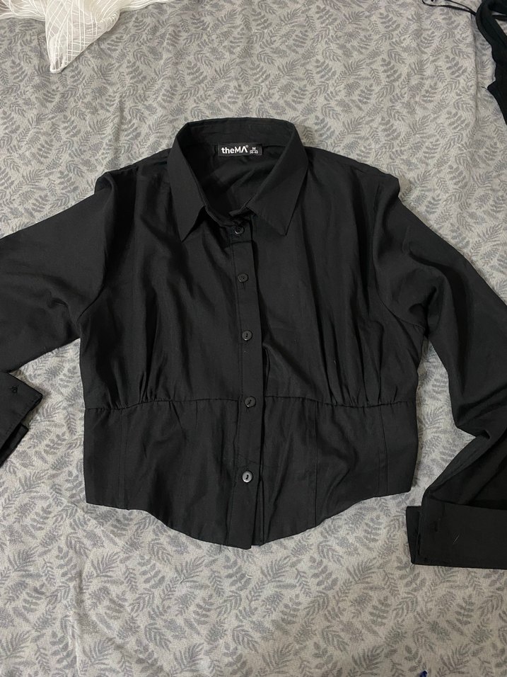 Düğmeli ve yakalı, siyah gotik stil uzun kollu gömlek. Rahat kesimli, ofis için uygun sentetik kumaştan yapılmıştır.