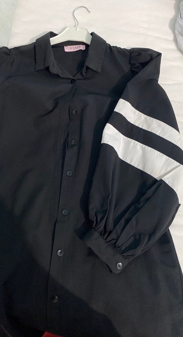 Siyah, düğmeli, uzun kollu ve yakalı gömlek. Kollarda beyaz şerit detayları bulunur. Rahat kesimli ve sentetik kumaştan üretilmiştir.