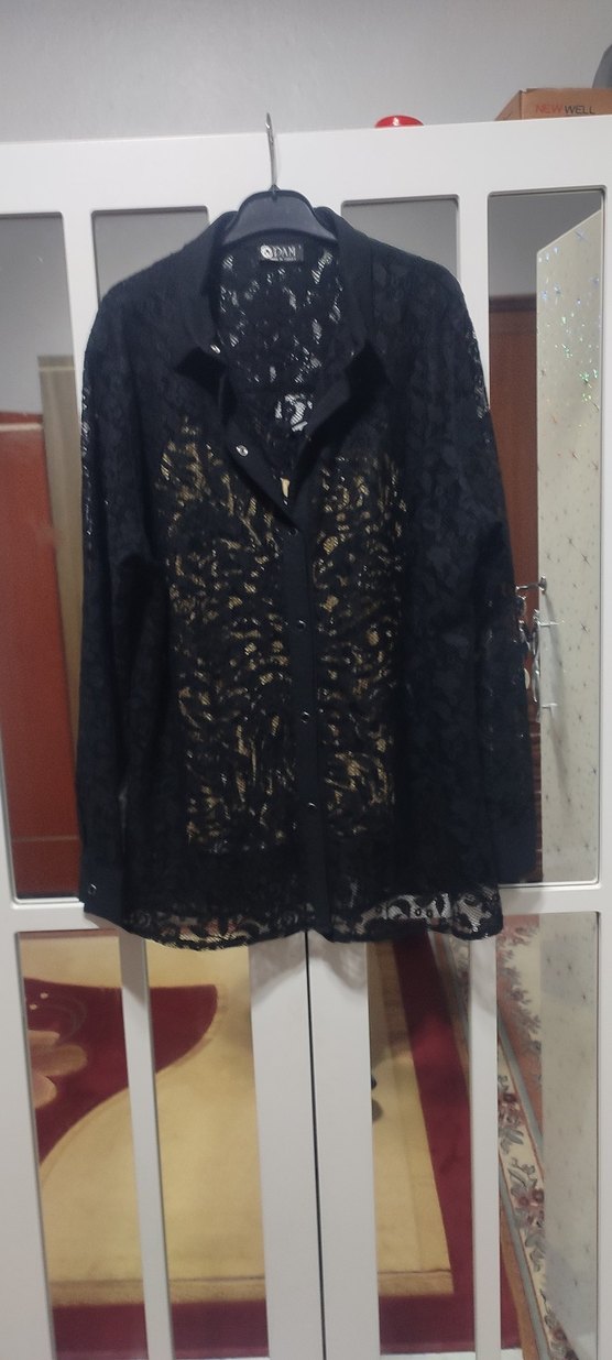 Düğmeli, desenli dantel kumaştan siyah uzun kollu bluz, kesik yaka ve bol kesim ile ofis için uygun. yeni şifre dir çok güzel çok şık güzel dir