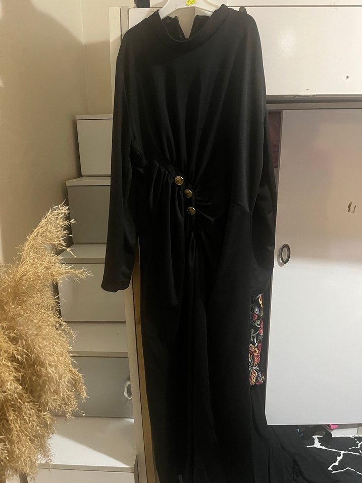 Siyah uzun kollu, yüksek yakalı ve düğmeli bu elbise, ipeksi kumaştan üretilmiş ve nakış detaylara sahip. Ofis kullanımı için uygun, bol kesim.