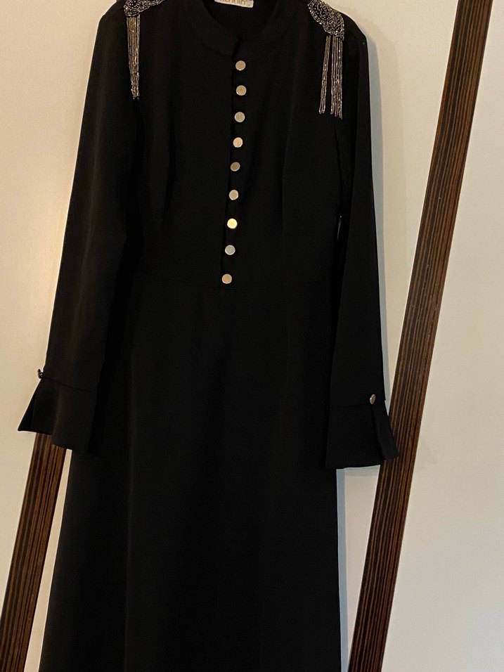 Siyah, düğmeli uzun kollu elbise, işlemeli detaylara sahip. Normal kesim, klasik Paris tarzı gotik ve ofis kullanımı için uygun.