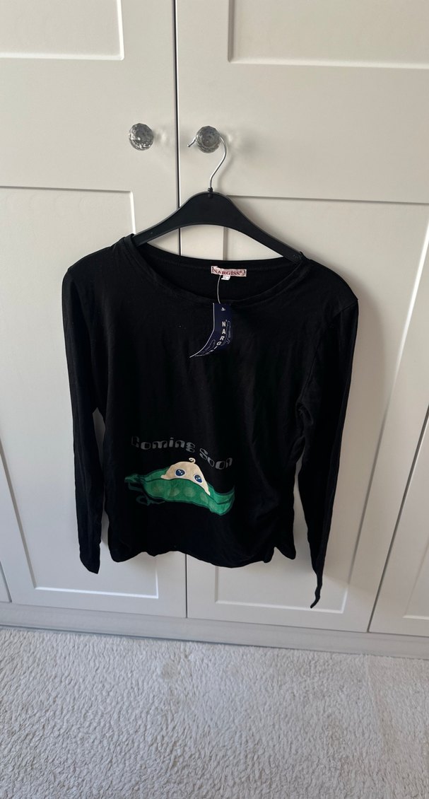 Düğmeli, baskılı siyah uzun kollu hamile tişörtü, yuvarlak yaka ve bol kesime sahip. Yumuşak ve sıcak kumaştan, romantik akşamlar için uygun.