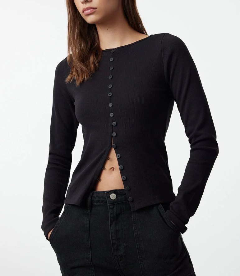 Siyah, düğmeli, uzun kollu ve yuvarlak yakalı, vücuda oturan denim bluz. Günlük kullanıma uygun normcore tarzda.