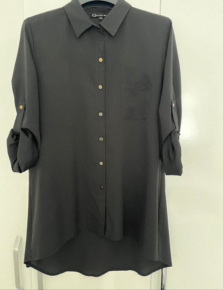 Düğmeli ve notalı yaka detaylı siyah kadın gömleği, ipeksi dokusu ve uzun kollu yapısıyla rahat ve şık bir görünüm sunar. Midi uzunlukta ve bol kesimdir. ✨ ürünü. Koltuk altı eni: 51 boy:79 cm Butik ürünü