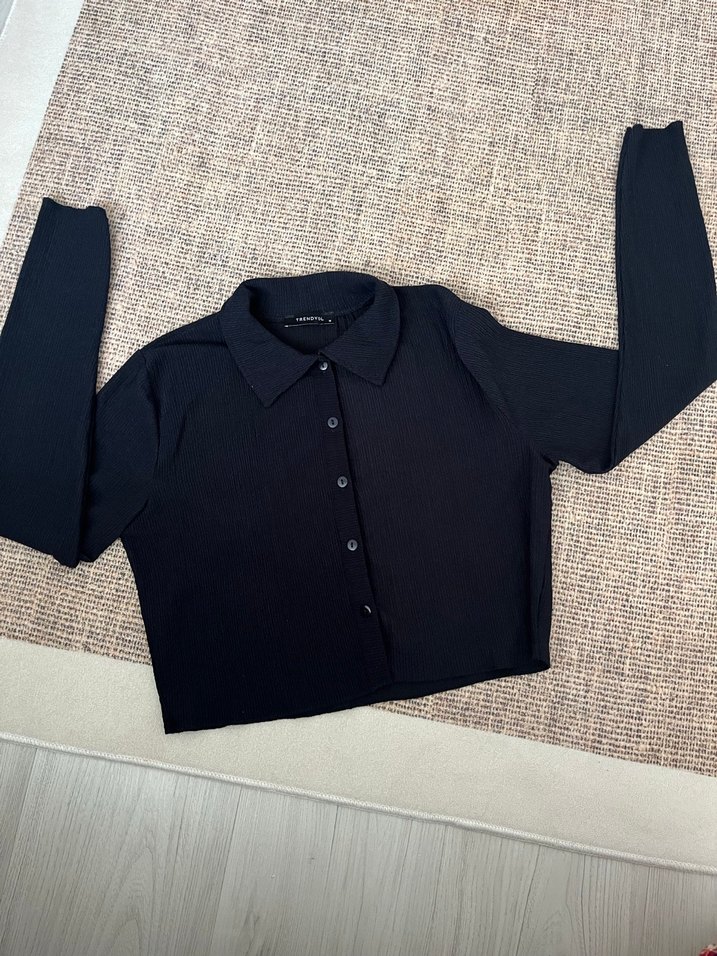 Siyah, düğmeli, uzun kollu, yakalı kadın gömleği. Normal kesim, desensiz, sentetik kumaştan, ofis ve günlük sokak stili için uygun.