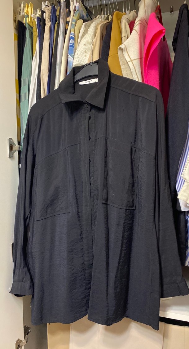 Siyah uzun kollu, düğmeli ve yakalı gömlek, rahat kesimi ve sentetik kumaşı ile gündelik kullanıma uygundur. İki göğüs cebine sahiptir. İki koltuk arası 56 santim boyu 69 santimdir bir kere giyilmiştir Overce bedendir XL giyeni de olur