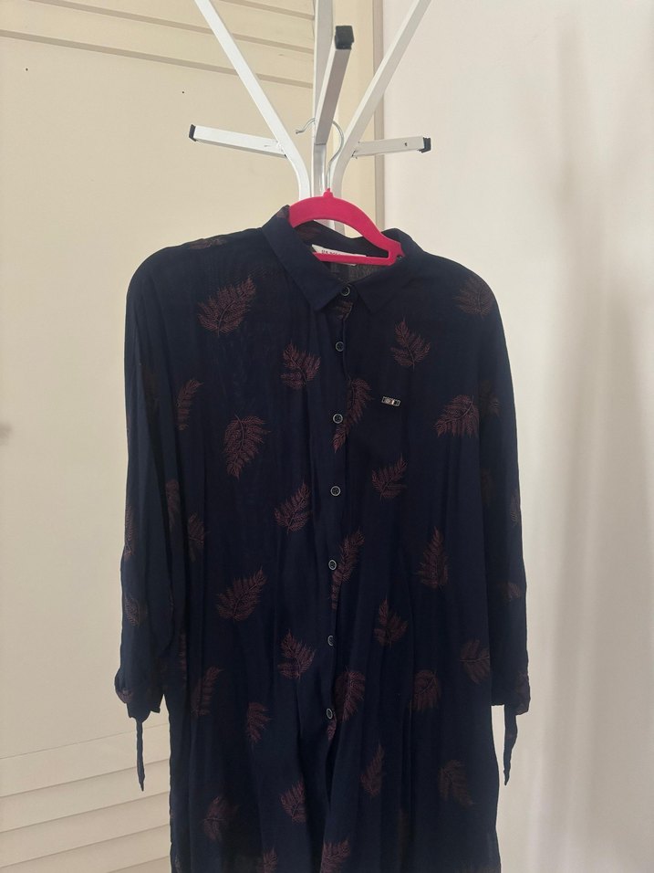 Düğmeli önü ve yakası kesimli, siyah uzun kollu kadın gömleği. Hafif bağlama desenli, sentetik kumaştan, rahat kesim.