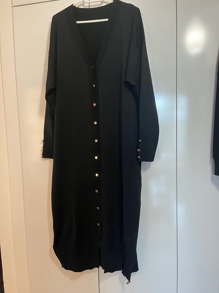 Düğmeli, siyah uzun kollu elbise, notched lapel yaka ve regular kesime sahiptir. Günlük kullanıma uygun, sentetik kumaştan yapılmıştır. #hırka #triko #ceket