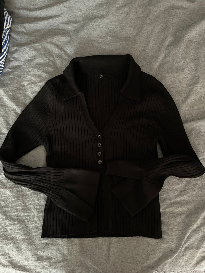Düğmeli, uzun kollu, yakalı ve fit kesim siyah kadın kazak. Günlük kullanıma uygun, gotik tarzda rahat bir parça.