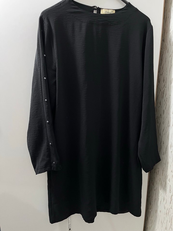 Siyah, uzun kollu, yuvarlak yakalı ve düğmeli detaylı kadife dokulu, bol kesim tunik. Günlük sokak stili için uygundur.