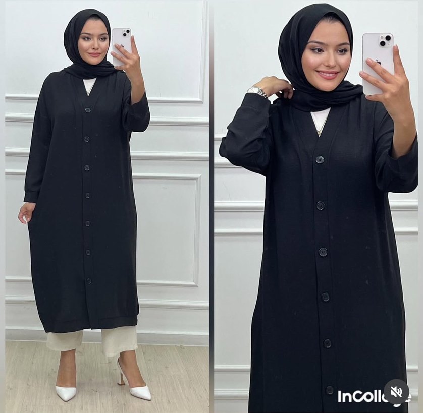 Düğmeli ön kısmı ve kesimli yakasıyla, ayrobin kumaştan yapılmış siyah uzun kollu, rahat kesim kap