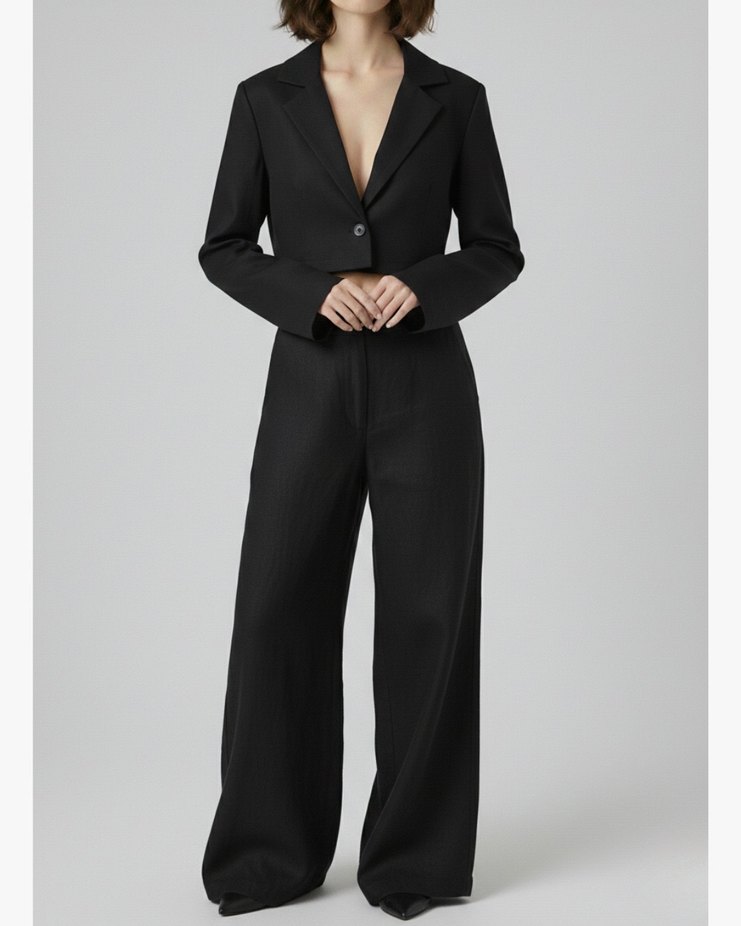 Düğmeli, siyah keten kadın takımı, uzun kollu ve keskin yaka detayına sahiptir. Ofis için uygun, modern ve rahat kesimlidir.