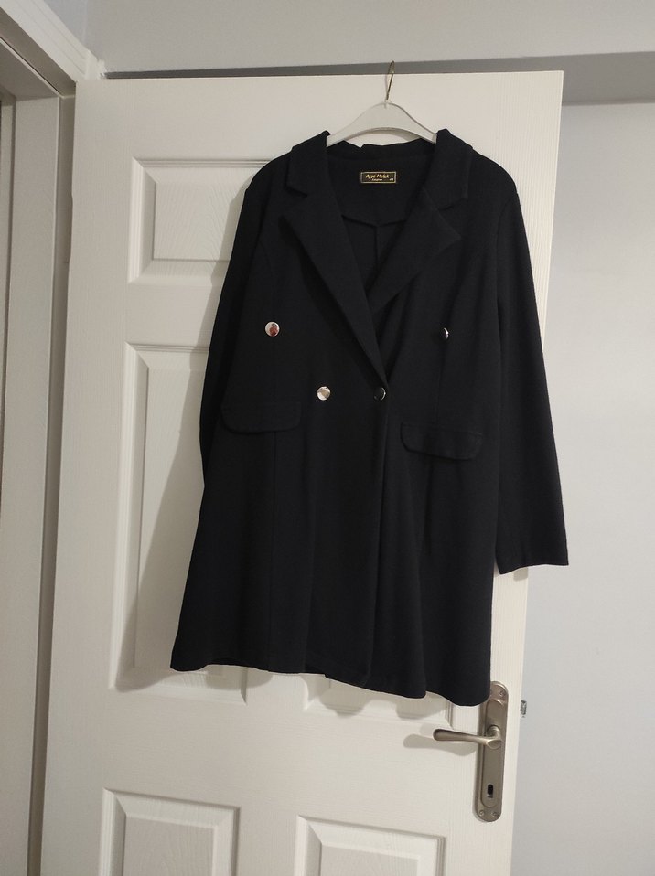 Düğmeli, siyah renkte kışlık ceket, notched yaka ve uzun kollu tasarımla. Rahat kesimi ve yumuşak sıcak kumaşı ofis kullanımı için uygundur.