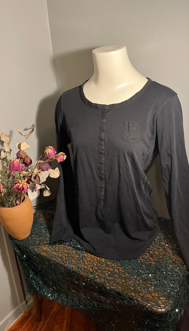 Düğmeli, yuvarlak yakalı, uzun kollu siyah tişörtü. Pamuklu kumaştan olup rahat ve günlük kullanıma uygundur. Bir-iki kez giyildi