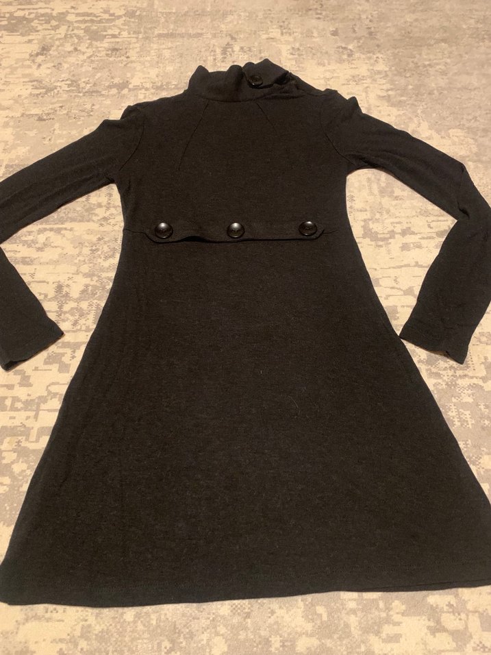 Yumuşak yünden yapılmış, yüksek yakalı ve uzun kollu, vücuda oturan siyah triko elbise. Göğüste düğme detayları bulunur, günlük kullanıma uygun rahat gotik tarz.