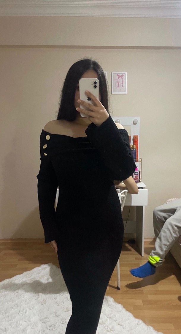 Düğmeli Siyah Uzun Kollu Triko Elbise