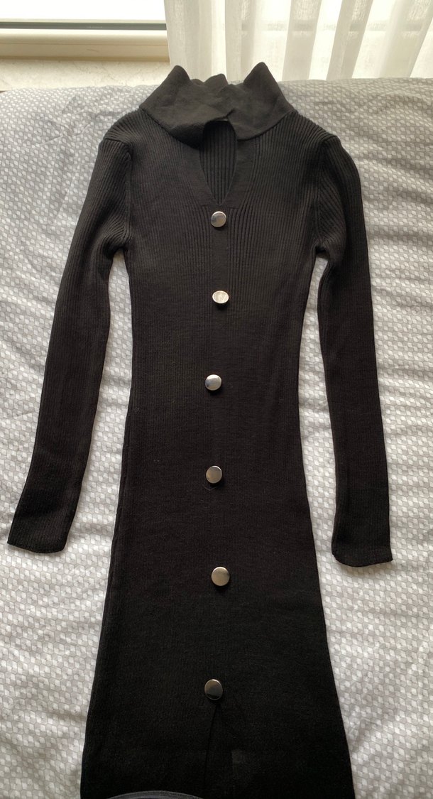 Düğmeli, yüksek yakalı siyah uzun kollu triko elbise. Rahat ve şık goth tarzını yansıtan, vücuda oturan kesimde günlük kullanıma uygun.