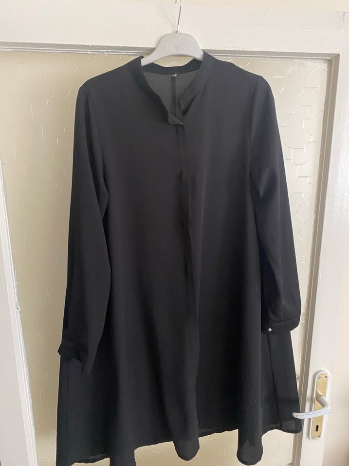 Düğmeli, uzun kollu, yüksek yakalı siyah tunik. Şık tunik aşağıya doğru bol kesim, ofis için uygun.