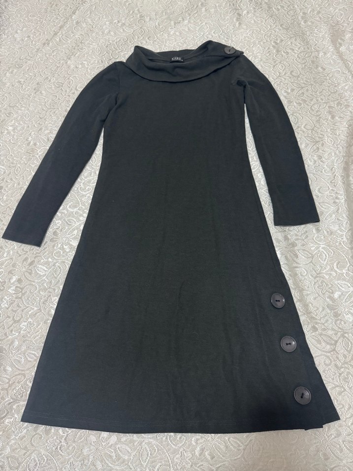Yüksek yakalı, uzun kollu ve bol kesim siyah uzun elbise. Yan tarafında düğme detayları bulunur, yumuşak sentetik kumaştan yapılmıştır.