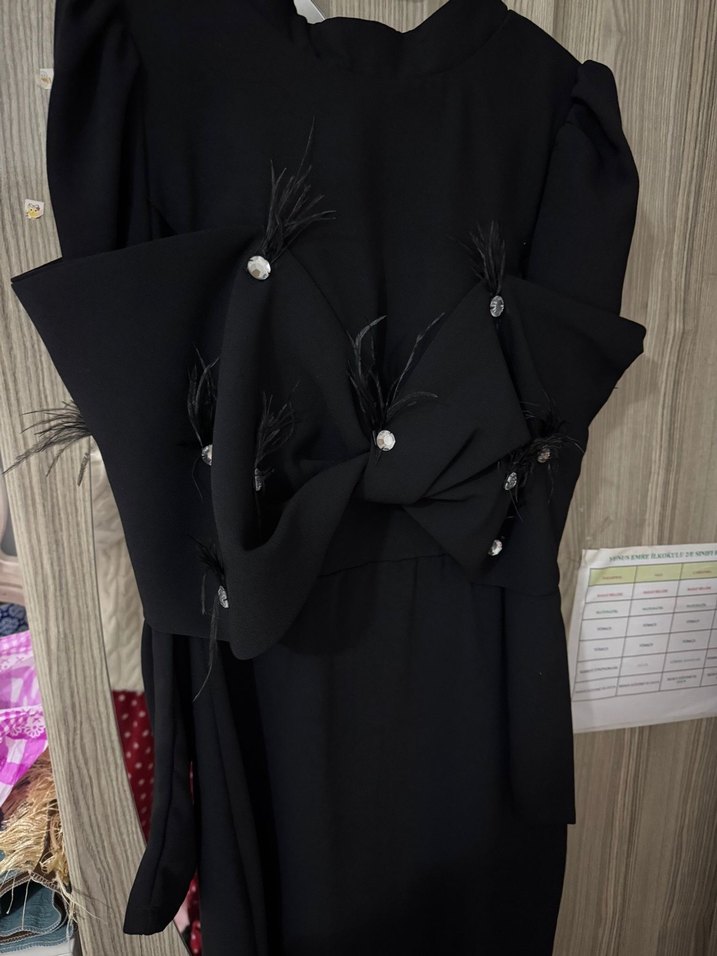 Düğmeli ön kısmı ve çentikli yaka detayı olan, uzun kollu, sentetik kumaştan yapılmış siyah kadın takımı. Düz renk, regular fit ve uzun boy, düğünler için uygun.