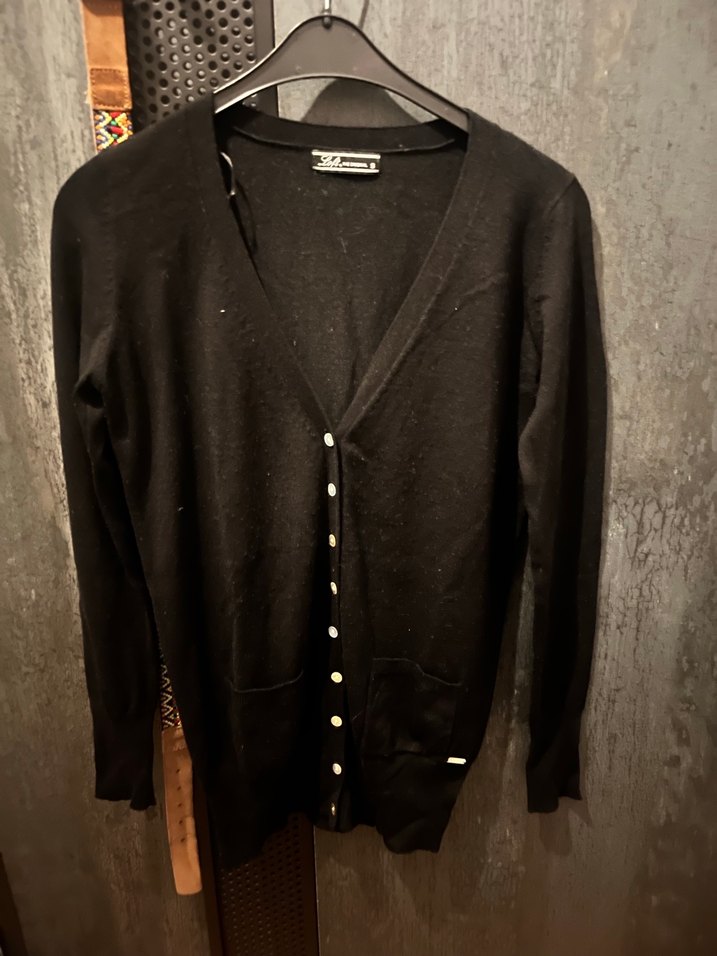 Düğmeli, uzun kollu, V yakalı siyah hırka. günlük rahat giyim için uygundur.