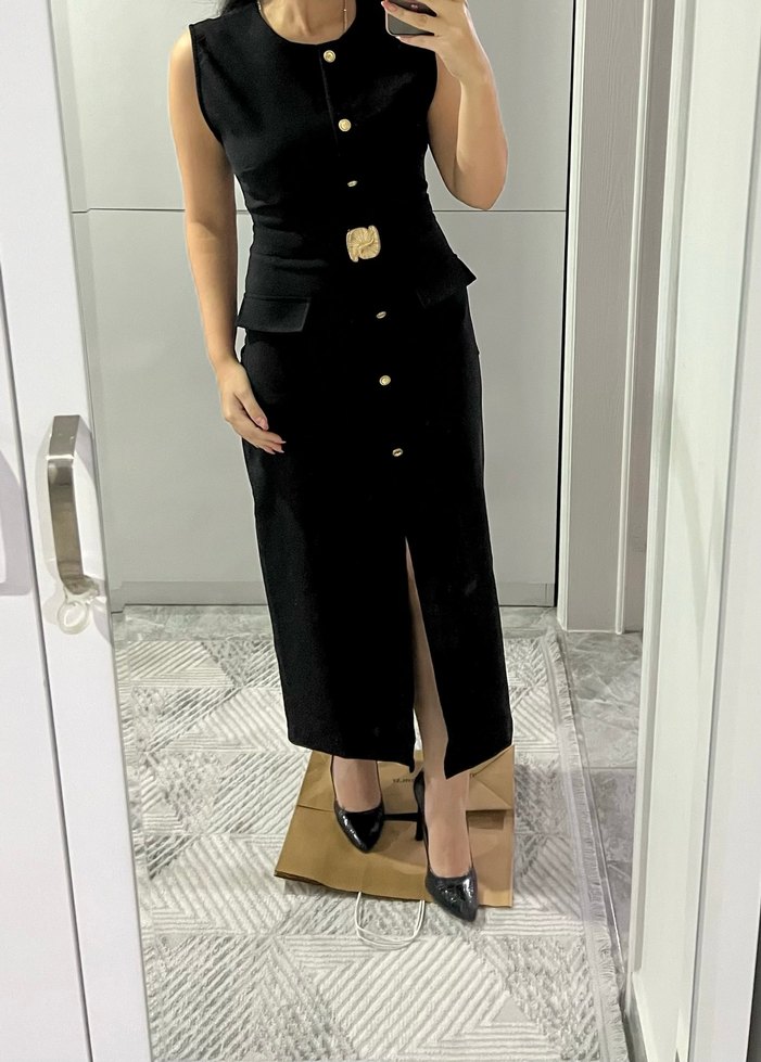 Düğmeli ön kısmı ve kesimli yaka detayıyla siyah uzun midi boy elbise. Tok bir kumaşı var, şık görünümlü. Marka temsili