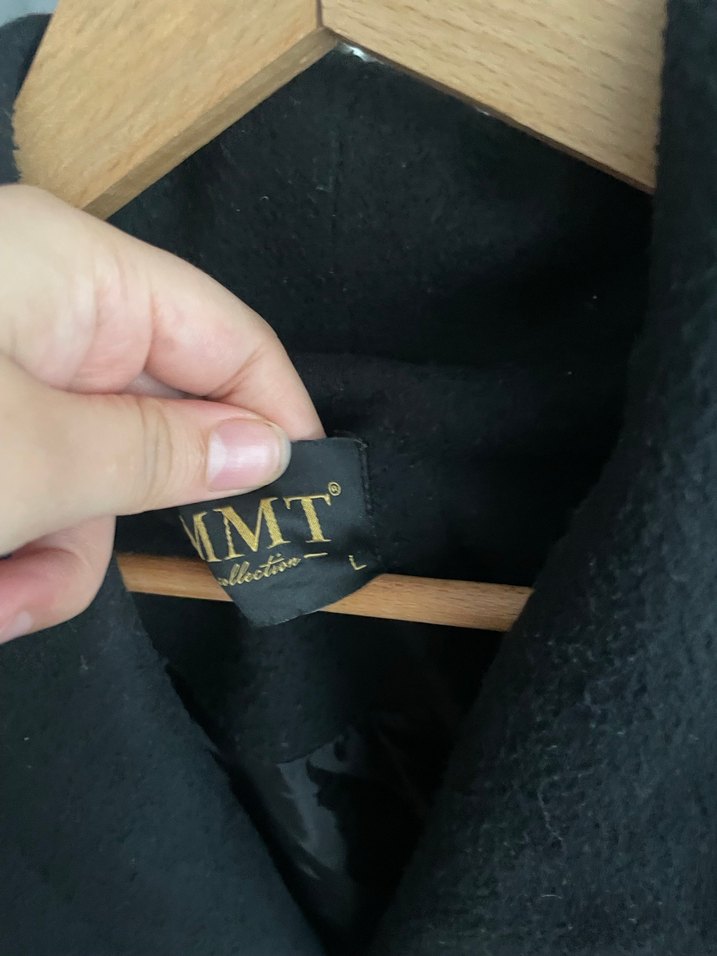 Düğmeli, siyah uzun kadın kaban, kesimli ve notlu yaka detaylıdır. Uzun kollu, baskılı ve midi uzunluktadır. Ofis için uygun goth ve Paris tarzı. Marka: MMT.