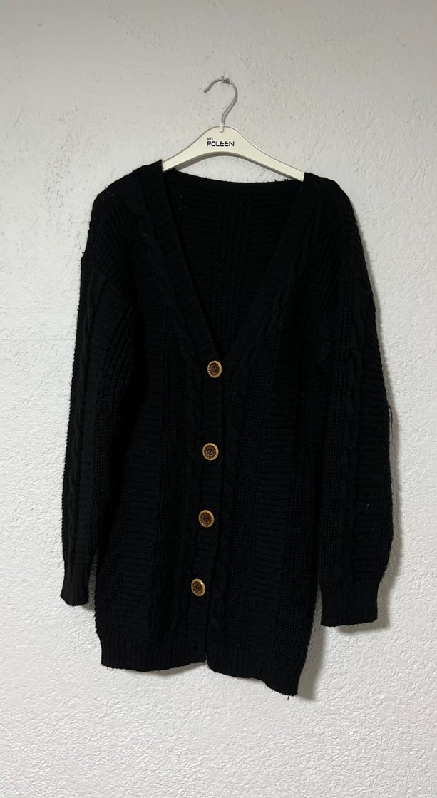 Bu siyah örgü hırka, düğmeli önü ve kesimli yaka detayıyla dikkat çeker. Uzun kollu, bol ve uzun kesimdir, rahat ve gotik tarzda kullanıma uygundur.